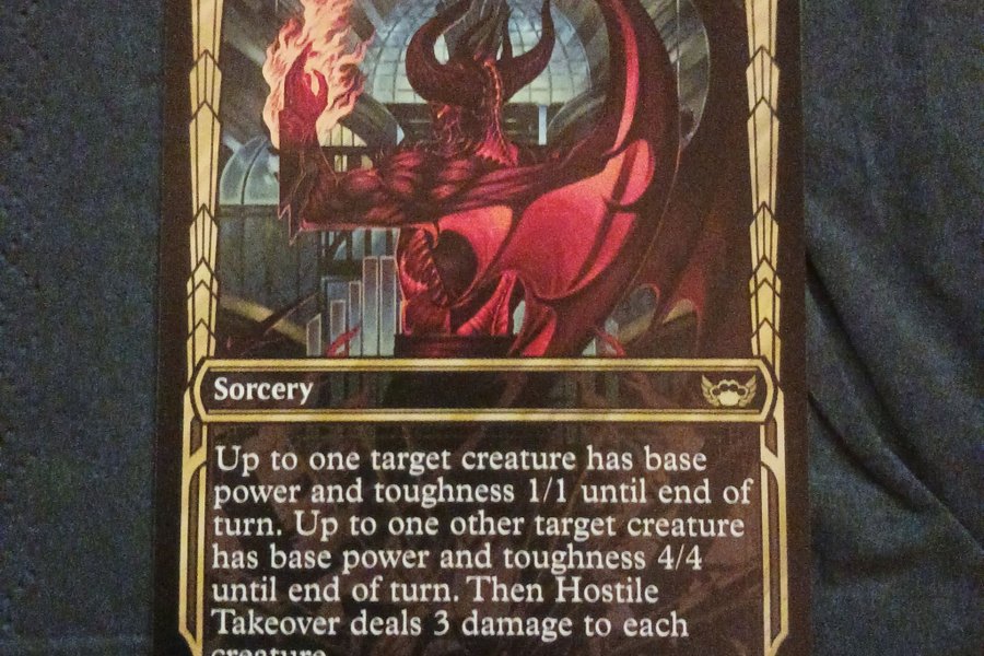 Kortet Hostile Takeover från Magic the Gathering. Kortet är av typen Sorcery. Upp till en måltavla varelse har basstyrka och tålighet 1/1 fram till slutet av turen. Upp till en annan måltavla varelse har basstyrka och tålighet 4/4 fram till slutet av turen. Sedan tillfogar Hostile Takeover 3 skada till varje varelse.