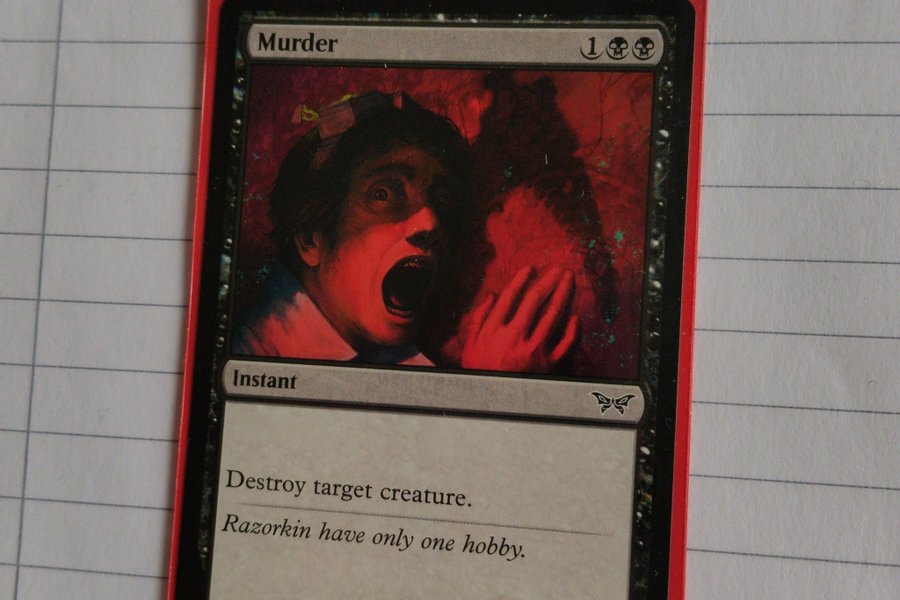 Kortet "Murder" från Magic the Gathering. Kortet är av typen Instant och har texten "Destroy target creature. Razorkin have only one hobby." Konstnären är Domenico Cava och kortet är från 2024 Wizards of the Coast.