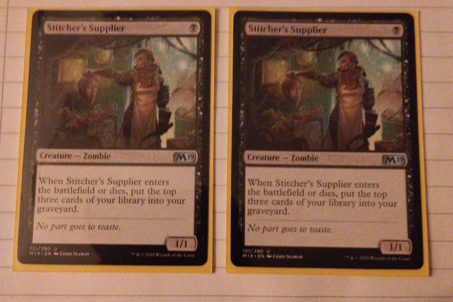 Stitcher's Supplier är ett svart varelsekort av typen Zombie. När Stitcher's Supplier kommer in på slagfältet eller dör, lägger du de översta tre korten från ditt bibliotek i din kyrkogård. Kortet är från upplagan M19.