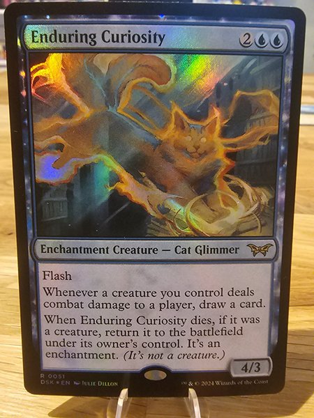 Kortet är av typen Enchantment Creature — Cat Glimmer. Det har förmågan Flash. När en varelse du kontrollerar tillfogar stridsskada på en spelare, dra ett kort. När Enduring Curiosity dör, om det var en varelse, återvänd det till slagfältet under dess ägares kontroll. Det är en förtrollning. (Det är inte en varelse.) Kortet har styrkan 4 och tåligheten 3.