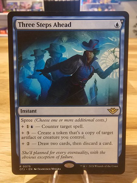 Kortet "Three Steps Ahead" från Magic the Gathering. Instant Spree (Välj en eller flera ytterligare kostnader.) +1U – Counter target spell. +3 – Create a token that's a copy of target artifact or creature you control. +2 – Draw two cards, then discard a card. R 0075 OTJ EN FRANCISCO MIYARA TM & © 2024 Wizards of the Coast.