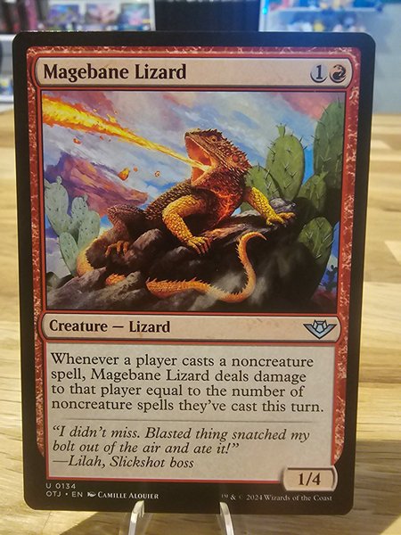 Magebane Lizard är ett rött varelsekort av typen ödla. Kortet har en manakostnad på 1 och 1 röd mana. Dess styrka är 1 och tålighet är 4. När en spelare kastar en icke-varelsebesvärjelse, delar Magebane Lizard ut skada till den spelaren lika med antalet icke-varelsebesvärjelser de har kastat denna tur.