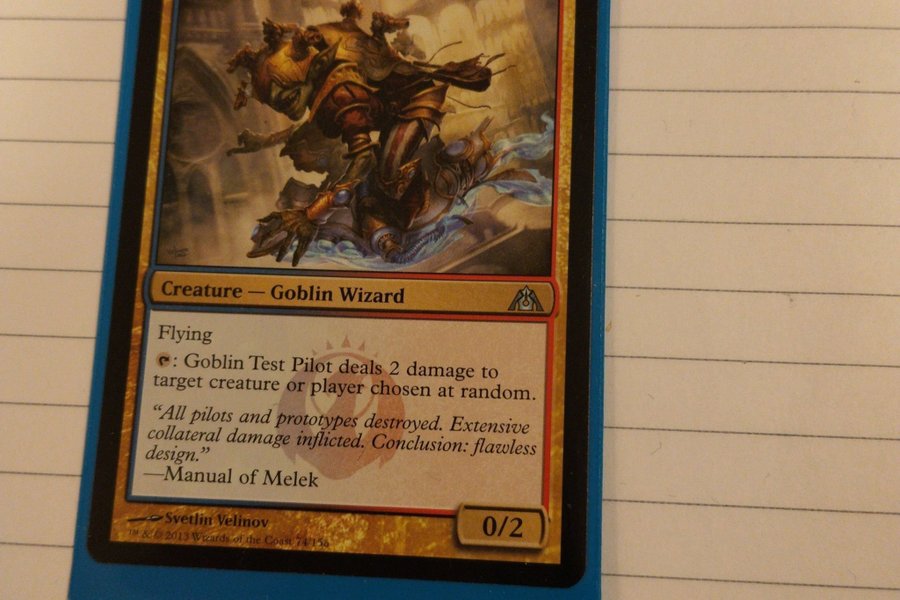 Kortet är av typen "Creature - Goblin Wizard" och har förmågan "Flying". När du tappar kortet, delar Goblin Test Pilot ut 2 skada till en slumpmässigt vald varelse eller spelare. Kortet är illustrerat av Svetlin Velinov och är från 2013.