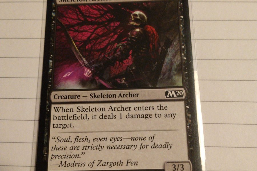 Kortet är av typen "Creature - Skeleton Archer" och har texten "When Skeleton Archer enters the battlefield, it deals 1 damage to any target." Konstnären är Randy Vargas och kortet är från upplagan M20.
