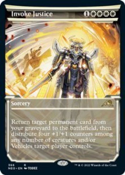 Invoke Justice är ett kraftfullt kort som både återupplivar en viktig permanent och samtidigt bygger upp din board med +1/+1 counters. Passar utmärkt i vita Commander-lekar som vill kombinera värde från graveyard med att stärka sina creatures. Ett kort som ofta vänder spelet till din fördel.