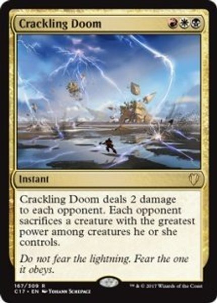 Crackling Doom är ett kraftfullt removal som påverkar alla motståndare samtidigt. Den tar bort de största hoten på bordet och ger dessutom extra skada, vilket gör den särskilt stark i Commander. Perfekt i Mardu-lekar som vill kontrollera spelet och hantera stora creatures effektivt.