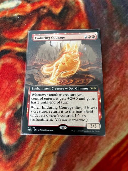 Kortet är av typen Enchantment Creature — Dog Glimmer. Mana kostnaden är 2 röd röd. Kortet har texten ”Whenever another creature you control enters, it gets +2/+0 and gains haste until end of turn. When Enduring Courage dies, if it was a creature, return it to the battlefield under its owner's control. It's an enchantment. (It's not a creature.)”. Kortet har styrka 3 och tålighet 3.