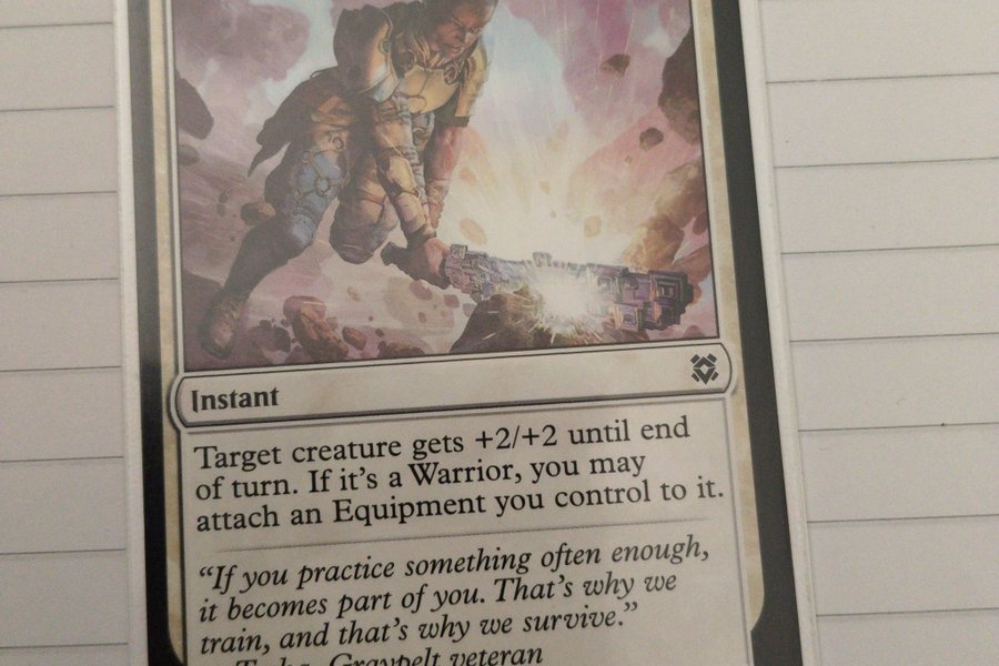 Kortet "Resolute Strike" från Magic The Gathering. Kortet är av typen Instant. Det ger en varelse +2/+2 tills slutet av turen. Om det är en krigare får du fästa en utrustning du kontrollerar till den.