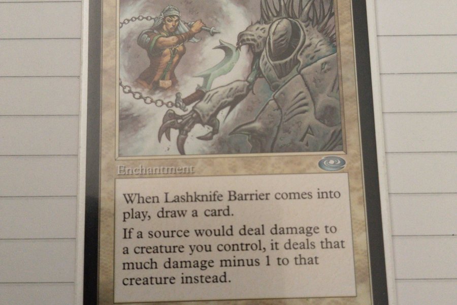 Lashknife Barrier är ett förtrollningskort. När Lashknife Barrier kommer i spel, dra ett kort. Om en källa skulle tillfoga skada på en varelse du kontrollerar, tillfogar den istället den skadan minus 1 på den varelsen.