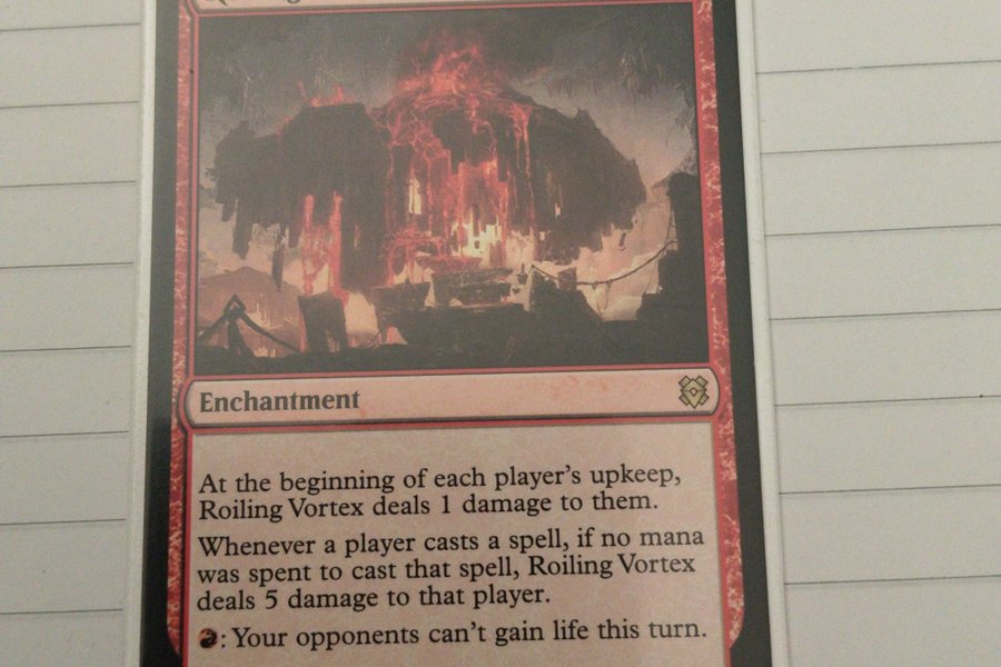 Roiling Vortex är ett förtrollningskort. I början av varje spelares upkeep, delar Roiling Vortex ut 1 skada till dem. När en spelare kastar en trollformel, om ingen mana spenderades för att kasta den trollformeln, delar Roiling Vortex ut 5 skada till den spelaren. Du kan betala 2 mana för att dina motståndare inte ska kunna få liv denna tur.
