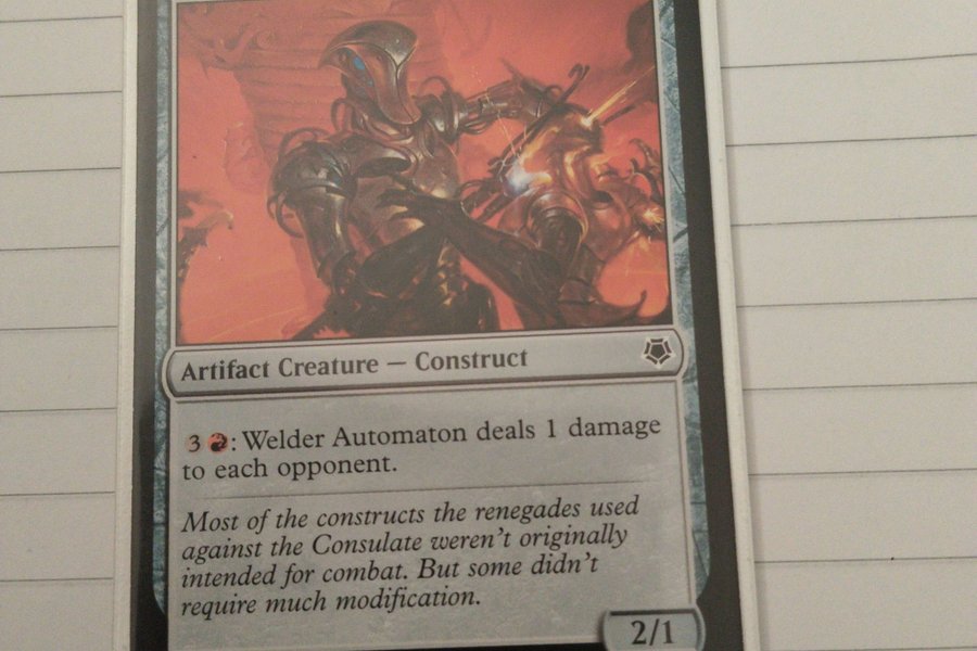 Kortet är av typen Artifact Creature — Construct. Mana kostnaden är 2. Kortet har förmågan 3, röd: Welder Automaton tillfogar 1 skada till varje motståndare. Kortet har 2 i attack och 1 i försvar.