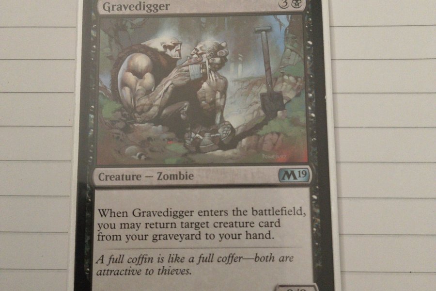 Magic the Gathering-kortet Gravedigger från uppsättningen M19. Kortet är av typen varelse – zombie. När Gravedigger kommer in på slagfältet får du ta tillbaka ett målkort från din kyrkogård till din hand. Kortet har styrkan 2 och tåligheten 2.