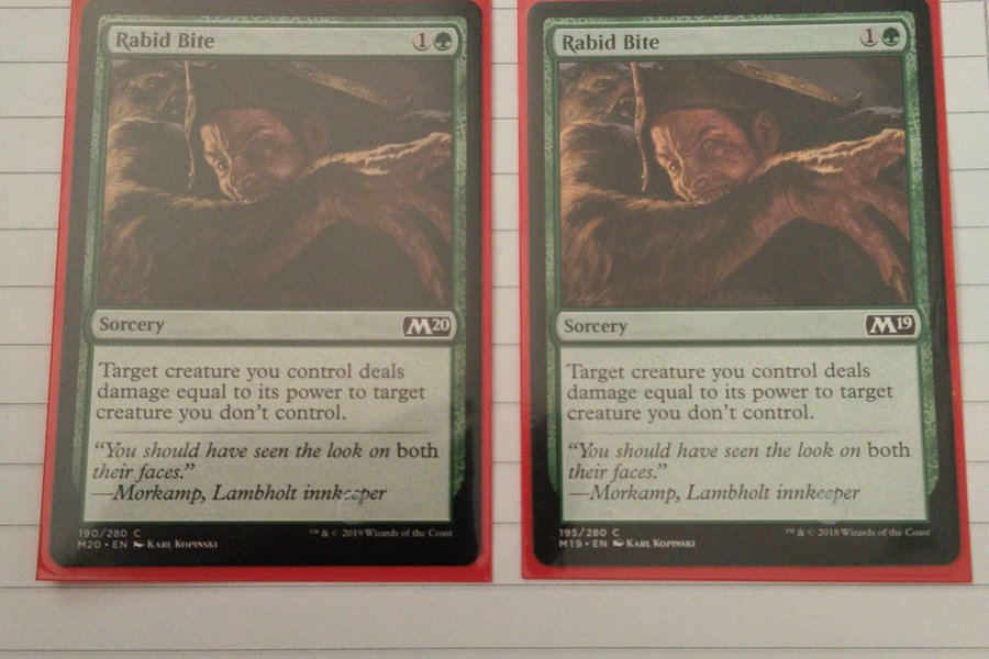 Två exemplar av kortet Rabid Bite. Det ena kortet är från M20-serien och det andra från M19-serien. Båda korten är av typen Sorcery och har en manakostnad på 1 grön och 1 färglös mana. Korttexten lyder: "Target creature you control deals damage equal to its power to target creature you don't control." Illustratör för båda korten är Karl Kopinski.