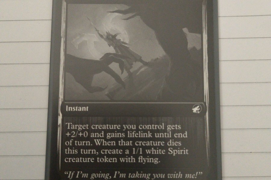 Kortet "Blessed Defiance" från Magic The Gathering. Kortet är av typen Instant. Det ger en varelse du kontrollerar +2/+0 och livlänk tills slutet av turen. Om varelsen dör denna tur, skapar du en 1/1 vit Spirit-varelsetoken med flygförmåga.