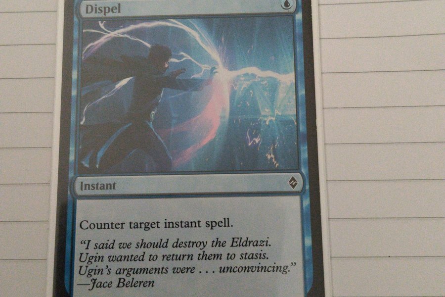 Kortet "Dispel" från Magic the Gathering. Kortet är av typen Instant och har förmågan att kontra en annan instant-besvärjelse. Kortet är från upplagan BFZ och har nummer 076/274.