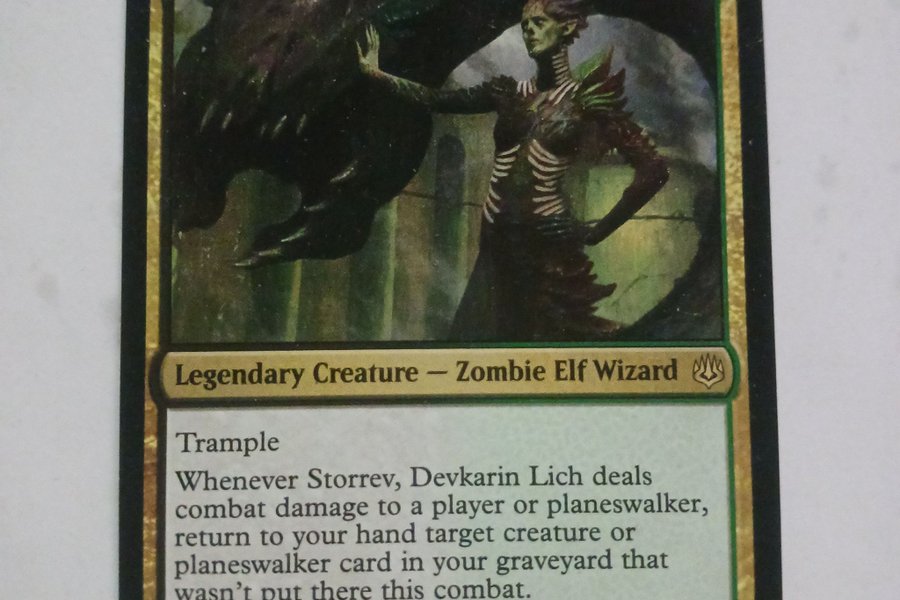 Kortet är en Legendary Creature - Zombie Elf Wizard med Trample. När Storrev, Devkarin Lich tillfogar stridsskada till en spelare eller planeswalker, returnera ett målkort för varelse eller planeswalker från din kyrkogård till din hand som inte lades dit under denna strid. Kortet har styrkan 5/4.
