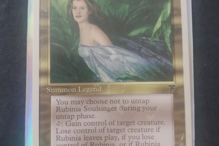Kortet Rubinia Soulsinger från Magic the Gathering. Observera att du kan välja att inte untappa Rubinia Soulsinger under din untappningsfas. Du kan också betala tre mana för att få kontroll över en målvärvare. Du förlorar kontrollen över målvärvaren om Rubinia lämnar spelet, om du förlorar kontrollen över Rubinia, eller om Rubinia blir untappad. Illustration av Rob Alexander.