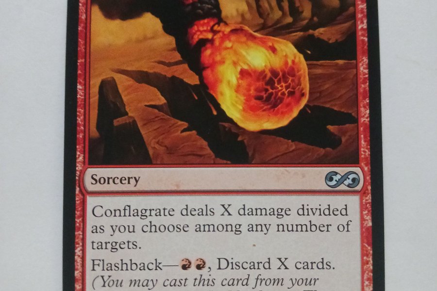 Conflagrate är ett sorcery-kort. Kortet har förmågan Flashback, vilket låter dig spela kortet från din kyrkogård genom att betala dess flashback-kostnad och kasta X kort. Conflagrate tillfogar X skada fördelat som du väljer mellan valfritt antal mål.