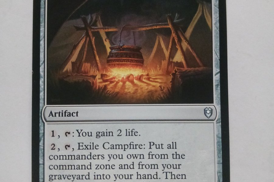 Kortet "Campfire" är ett artefaktkort. För 1 mana och tappning får du 2 liv. För 2 mana, tappning och exilering av Campfire, lägger du alla befälhavare du äger från kommandzonen och från din kyrkogård på din hand. Därefter blandar du din kyrkogård in i ditt bibliotek. Kortet är från upplagan CLB och har nummer 304/361.