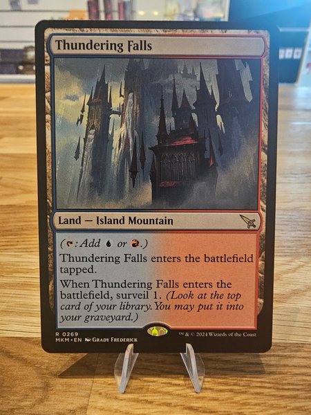 Kortet "Thundering Falls" är ett landkort av typen Island Mountain. Det lägger till antingen blå eller röd mana. När Thundering Falls kommer in på slagfältet, kommer det in tappat. När Thundering Falls kommer in på slagfältet, surveil 1 (Titta på det översta kortet i ditt bibliotek. Du får lägga det i din kyrkogård).