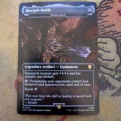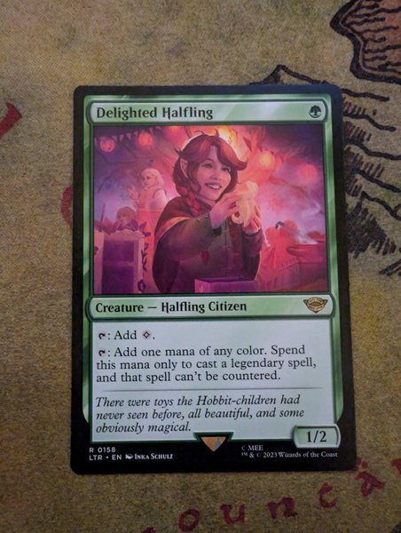 Kortet "Delighted Halfling" från Magic the Gathering. Mana: 1 grön. Typ: Varelse - Halfling Medborgare. Text: "Tappa: Lägg till 1 färglös mana. Tappa: Lägg till en mana av valfri färg. Spendera denna mana endast för att spela en legendarisk trollformel, och den trollformeln kan inte motverkas." Styrka/Tålighet: 1/2. Kortnummer: R 0158. Set: LTR. Språk: EN. Illustratör: Inka Schulz.