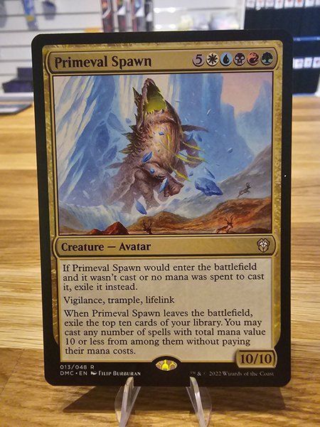 Kortet "Primeval Spawn" är ett legendariskt varelse-kort av typen Avatar. Det har en manakostnad på 5 generisk mana, 1 vit mana, 1 blå mana, 1 svart mana, 1 röd mana och 1 grön mana. Kortet har förmågorna Vigilance, Trample och Lifelink. När Primeval Spawn kommer in på slagfältet och inte har blivit castat eller om ingen mana spenderades för att casta det, exilera det istället. När Primeval Spawn lämnar slagfältet, exilera de översta tio korten från ditt bibliotek. Du får sedan casta valfritt antal trollformler med ett totalt manavärde på 10 eller mindre från bland dem utan att betala deras manakostnader. Kortet har styrkan 10 och tåligheten 10.