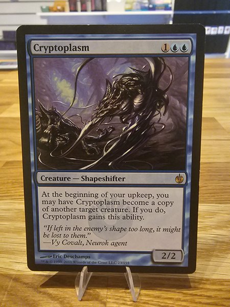Kortet Cryptoplasm från Magic the Gathering. Mana kostnad: 1 blå, blå. Typ: Varelse – Formskiftare. Korttext: I början av din upkeep får du Cryptoplasm att bli en kopia av en annan målvärld. Om du gör det, får Cryptoplasm denna förmåga. Styrka/Tålighet: 2/2. Konstnär: Eric Deschamps. Set: Mirrodin Besieged. Nummer: 23/155.