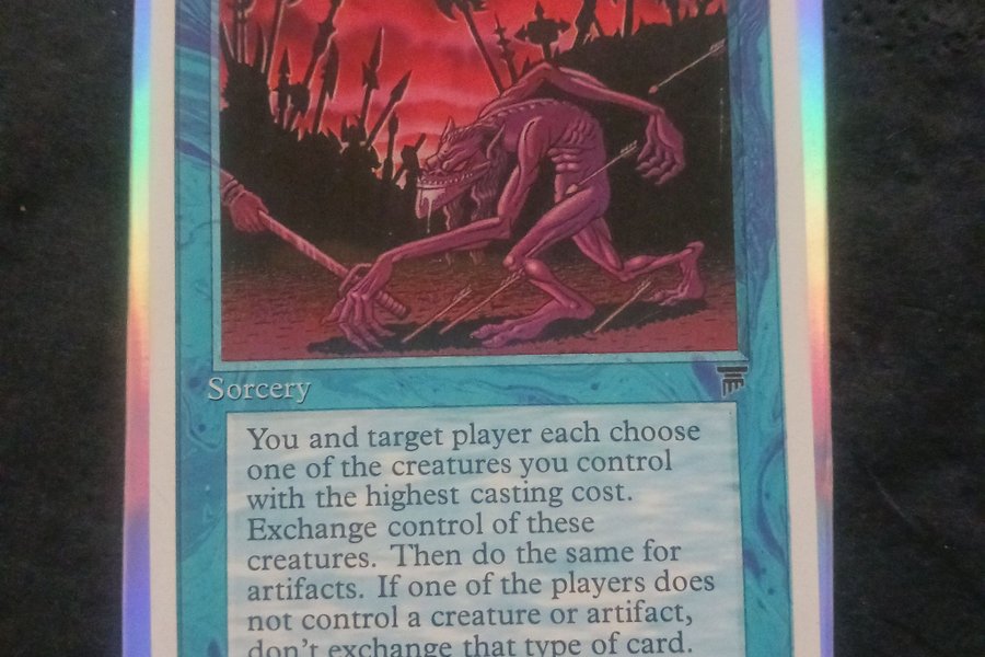 Kortet "Juxtapose" från Magic the Gathering. Kortet är av typen Sorcery. Illustration av Justin Hampton. Utgivet 1995 av Wizards of the Coast, Inc.