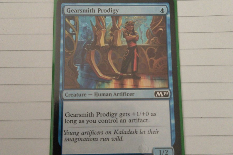 Gearsmith Prodigy är ett varelsekort av typen Human Artificer. Kortet ger Gearsmith Prodigy +1/+0 så länge du kontrollerar en artefakt. Kortet är från 2018.