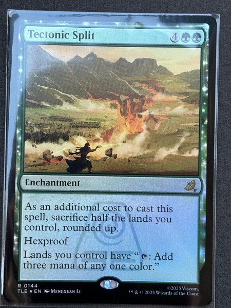 Ett förtrollningskort från Magic the Gathering. Kortet heter Tectonic Split och har texten "As an additional cost to cast this spell, sacrifice half the lands you control, rounded up. Hexproof Lands you control have “: Add three mana of any one color.”" Kortet är av typen Enchantment.