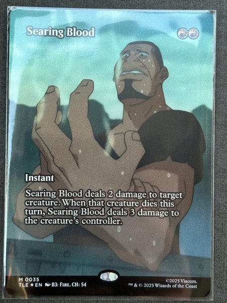 Searing Blood är ett Instant-kort. Kortet tillfogar 2 skada på en varelse. Om varelsen dör denna tur, tillfogar Searing Blood 3 skada på varelsens kontrollant. Kortet är från 2025.