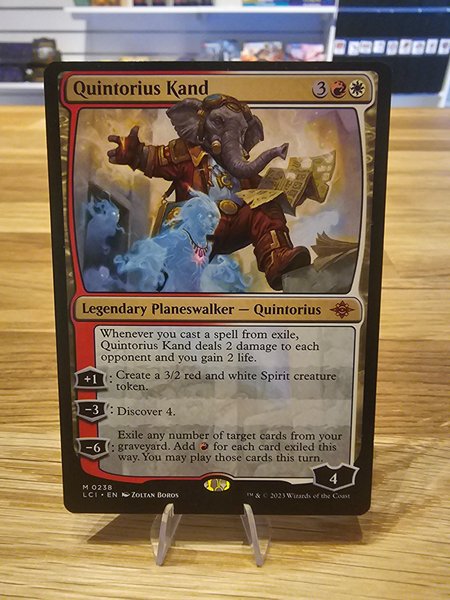 Kortet är Quintorius Kand, en legendarisk planeswalker. När du kastar en trollformel från exil, delar Quintorius Kand ut 2 skada till varje motståndare och du får 2 liv. Dess förmågor inkluderar att skapa en 3/2 röd och vit Spirit varelsetoken, Discover 4, och exilera valfritt antal målkort från din kyrkogård för att lägga till mana för varje kort som exilerats på detta sätt, och du får spela dessa kort denna tur.
