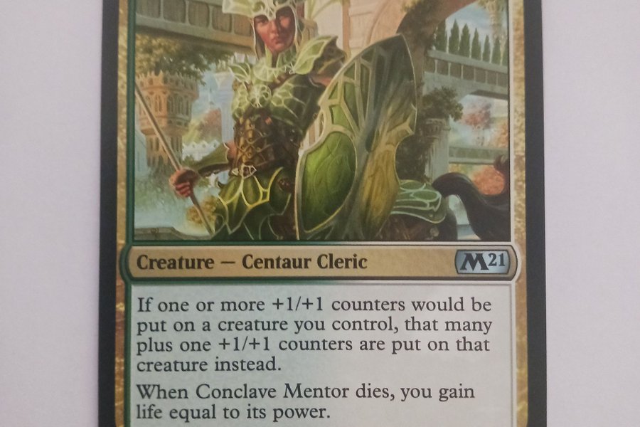 Conclave Mentor är ett sällsynt varelsekort av typen Centaur Cleric från Magic the Gathering-setet M21. Kortet har förmågan att lägga till ytterligare +1/+1-räknare på varelser du kontrollerar och ger dig liv när Conclave Mentor dör. Illustrerad av Raoul Vitale.