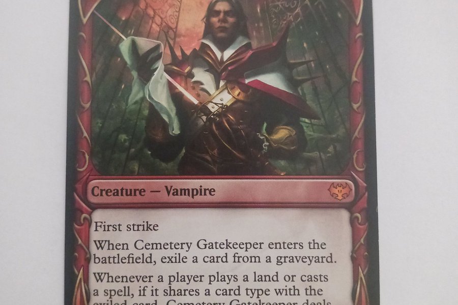 Kortet är av typen varelse – vampyr. Det har förmågan "First strike". När Cemetery Gatekeeper kommer in på slagfältet, exilera ett kort från en kyrkogård. När en spelare spelar ett land eller kastar en trollformel, om det delar en korttyp med det exilerade kortet, delar Cemetery Gatekeeper ut 2 skada till den spelaren. Kortet har styrkan 2 och tåligheten 1.