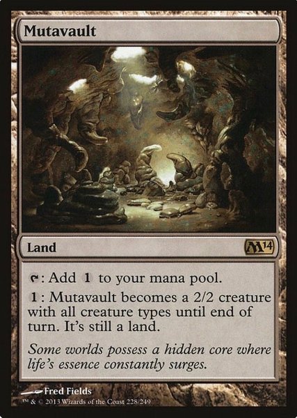 Kortet ”Mutavault” från Magic the Gathering. Kortet är av typen ”Land” och har förmågan att generera 1 mana. För 1 mana kan Mutavault bli en 2/2 varelse med alla varelsetyper fram till slutet av turen, samtidigt som den fortfarande är en land.