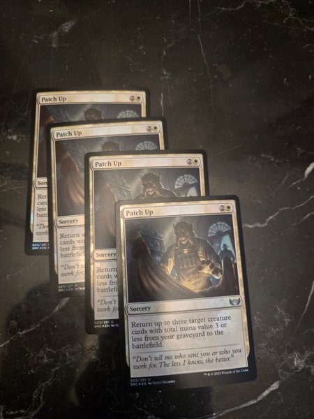 Kortet "Patch Up" från Magic the Gathering. Ett sorcery-kort som låter dig återföra upp till tre varelsekort med en total manakostnad på 3 eller mindre från din kyrkogård till slagfältet.