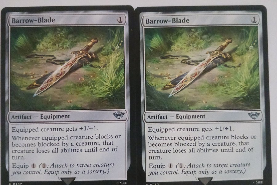 Barrow-Blade är ett artefaktutrustningkort. Utrustad varelse får +1/+1. När en utrustad varelse blockerar eller blir blockerad av en varelse, förlorar den varelsen alla förmågor fram till slutet av turen. Utrusta 1 (1: Fäst vid målvärden du kontrollerar. Utrusta endast som en sorcery).