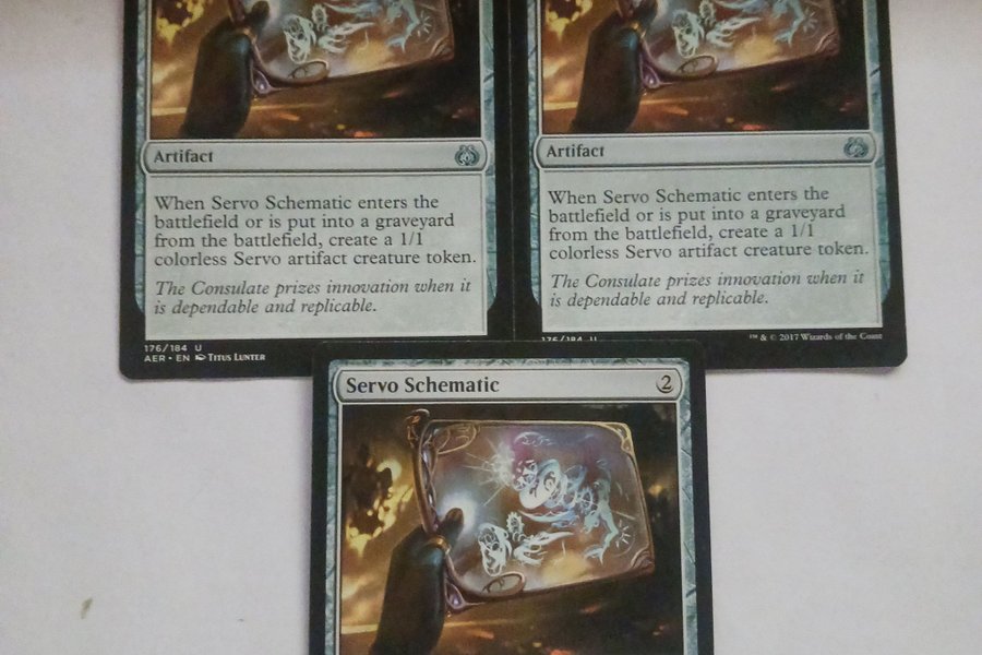 Kortet är av typen Artifact. När Servo Schematic kommer in på slagfältet eller läggs i en kyrkogård från slagfältet, skapa en 1/1 färglös Servo artifact varelsetoken. Konsulatet värdesätter innovation när den är pålitlig och replikerbar. Kortet är numrerat 176/184 U och är från uppsättningen AER. Illustratör är Titus Lunter.