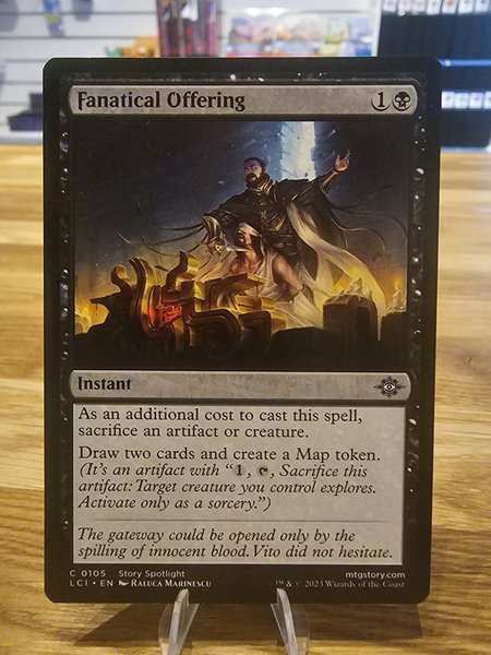 Fanatical Offering, ett Instant-kort från Magic the Gathering. Som en extra kostnad för att kasta denna trollformel, offra en artefakt eller varelse. Dra två kort och skapa en kartmarkör. (Det är en artefakt med "1, T, Offra denna artefakt: Målvärvarelsen du kontrollerar utforskar. Aktivera endast som en sorcery.")