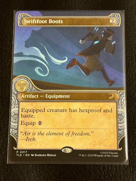 Kortet "Swiftfoot Boots" är ett artefaktutrustningskort. Det ger den utrustade varelsen hexproof och haste. Utrusta kostar 1 mana. Kortet är från upplagan TLE och har nummer P0317. Illustratör är Barbara Rosiak.