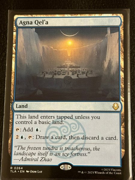 Kortet "Agna Qel'a" från Magic the Gathering. Detta land kommer in tappat om du inte kontrollerar ett grundläggande land. Lägg till ett blått mana. För två mana och ett blått mana, dra ett kort och kasta sedan ett kort.