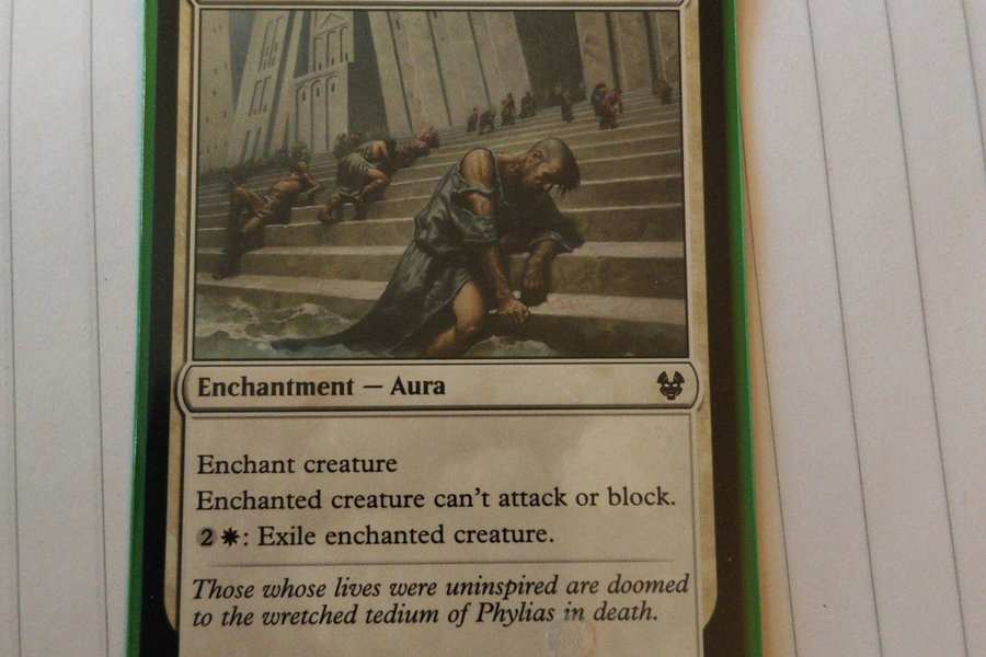 Dreadful Apathy är ett förtrollningskort av typen Aura. Kortenjämnt varelse kan inte attackera eller blockera. För 2 och ett vitt mana, exilera den förtrollade varelsen. Kortet är från upplagan THB och har kortnummer 011/254.