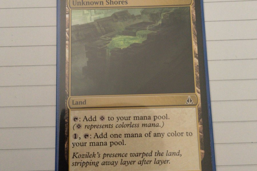Kortet "Unknown Shores" från Magic the Gathering. Mana: Lägg till färglös mana i din mana-pool. 1, Mana: Lägg till valfri färg på mana i din mana-pool. Kozileks närvaro förvrängde landet och skalade bort lager efter lager.