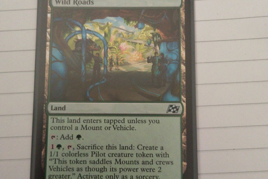 Kortet "Wild Roads" är ett landkort. Det kommer in i spel tappat om du inte kontrollerar en Mount eller Vehicle. Kortet kan tappas för att lägga till ett grönt mana. För 1 grön mana, 1 färglös mana och genom att offra kortet, skapar du en 1/1 färglös Pilot-varelsetoken med förmågan "Denna token sadlar Mounts och crewar Vehicles som om dess styrka vore 2 större." Denna förmåga kan endast aktiveras som en sorcery.