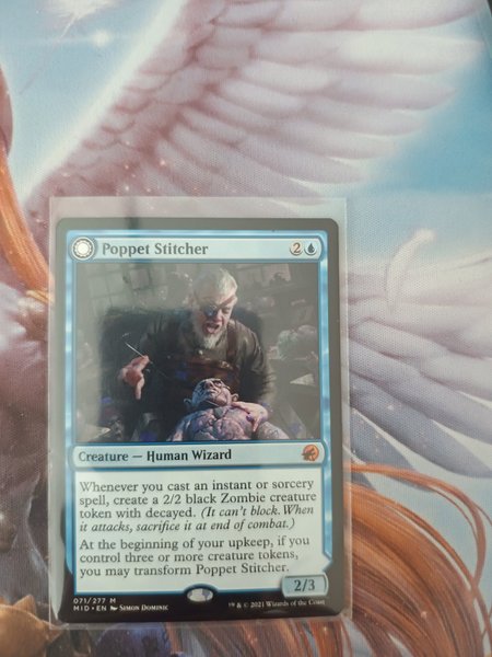 Kortet är av typen "Creature - Human Wizard" och har förmågan att skapa en 2/2 svart Zombie varelsetoken med decayed när du kastar en instant eller sorcery spell. I början av din upkeep, om du kontrollerar tre eller fler varelsetokens, får du transformera Poppet Stitcher.
