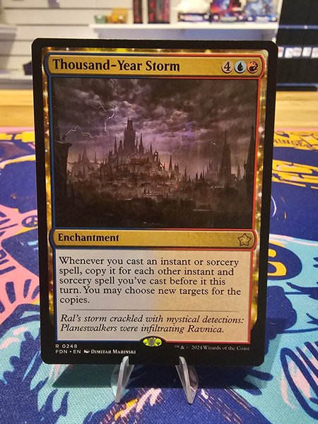 Thousand-Year Storm är ett förtrollningskort. När du kastar en "instant" eller "sorcery"-spell, kopiera den för varje annan "instant" eller "sorcery"-spell du har kastat tidigare denna tur. Du får välja nya mål för kopiorna.
