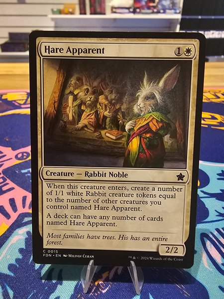 Kortet "Hare Apparent" är ett vitt varelsekort av typen Rabbit Noble. När kortet kommer in i spel skapar det 1/1 vita Rabbit-varelsetoken. En kortlek kan innehålla valfritt antal kort med namnet Hare Apparent. Kortet har styrkan 2 och tåligheten 2.