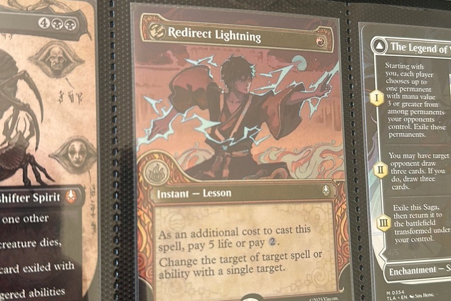 Kortet "Redirect Lightning" från Magic The Gathering. Kortet är av typen Instant - Lesson. Som en extra kostnad för att spela denna trollformel, betala 5 liv eller betala 2. Ändra målet för måltrollformeln eller förmågan med ett enda mål.