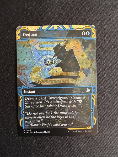 Kortet "Deduce" från Magic The Gathering. Kortet är av typen "Instant" och har förmågan "Draw a card. Investigate. (Create a Clue token. It's an artifact with "2, Sacrifice this token: Draw a card.")". Konstnären är Dominik Mayer.