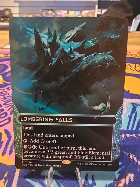 Lumbering Falls är ett landkort som kommer in tappat. Det ger antingen grönt eller blått mana. För två generiska, ett grönt och ett blått mana, blir Lumbering Falls en 3/3 grön och blå Elemental varelse med hexproof fram till slutet av turen. Det är fortfarande ett land.